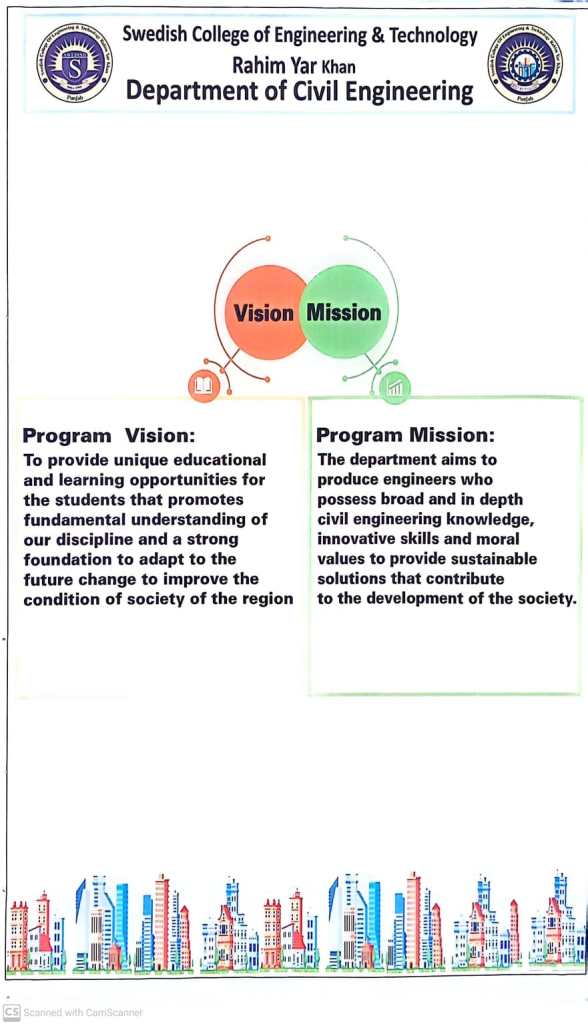 The department aims to produce engineers who possess broad and in depth civil engineering knowledge, innovative skills and moral values to provide sustainable solutions that contribute to the development of the society.